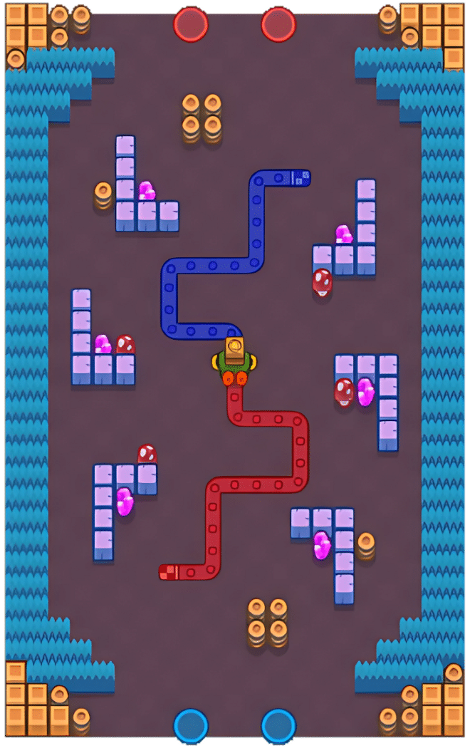 Barrels and wall corners near the belts are perfect for ambushes. Brawlers like Leon or Shelly can wait and burst down passing enemies.
